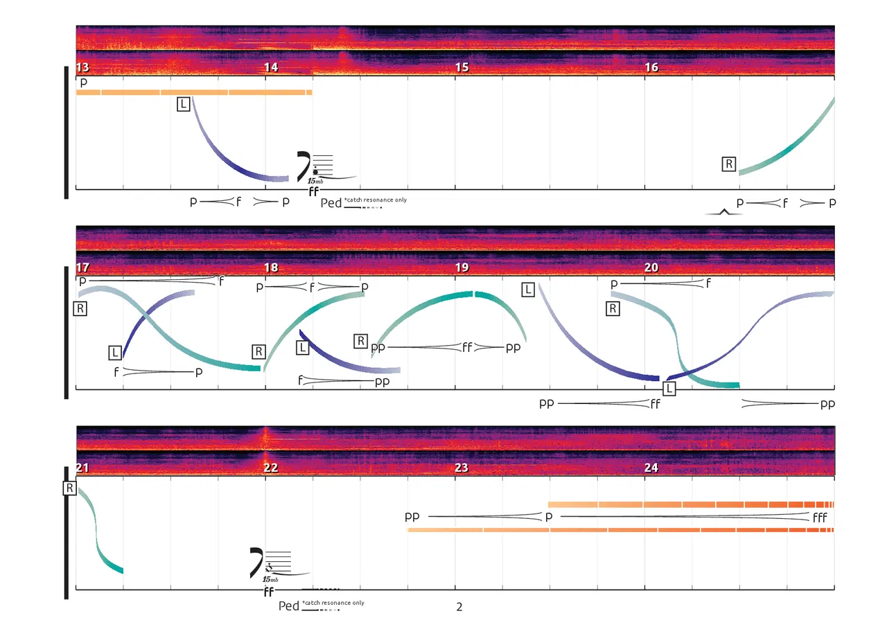 The work is directly inspired by the photographer Xavi Bou’s Ornitographies series, in which he superimposes multiple photographs of birds in flight into a singular image, articulating their shifting trajectories and contours as ribbons traced in the sky. In The Migratory Patterns of Birds, microphones are used to reorient the listening perspective and track the physical movement of sound across the instrument. The swarms, contours, and murmurations captured in these photographs are used as notational guides for the musical material. Instrumental sounds are combined with field recordings of natural and human environments, animals, and movement.